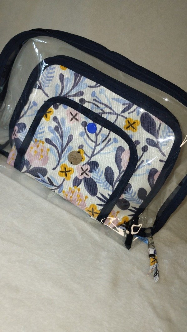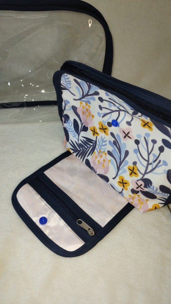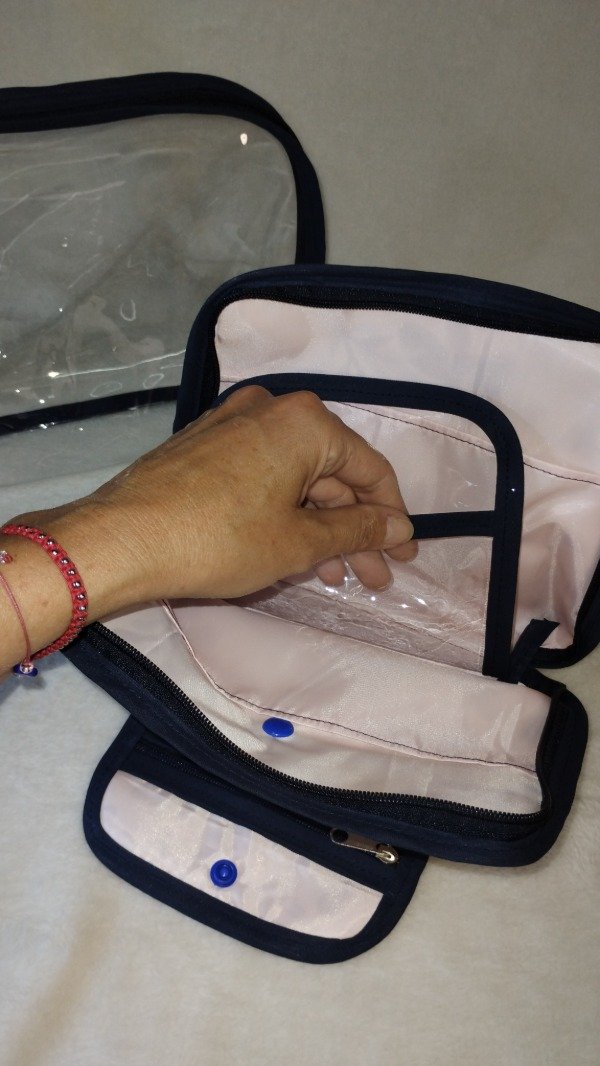 Cuenta con un necesser super amplio en nylon cristal y otro mas pequeño en tela impermeable. El mas pequeño tiene un bolsillo con cierre en su exterior y en su interior 2 bolsillos amplio y otro compartimento en nylon.